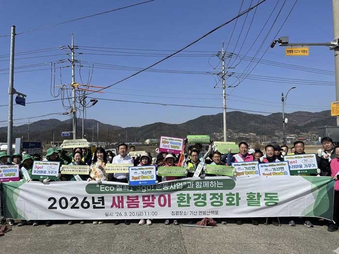 ‘3go! 운동 사업’은 ‘먼저 쓸go, 먼저 줍go, 먼저 치우go’라는 슬로건 아래, 주민 스스로 마을을 가꾸자는 취지의 주민 주도형 정화 활동이다. 이번 행사는 관내 14개 단체 및 공무원 80여명이 참여한 가운데, 지속적인 3go! 활동에 대한 결의 다짐을 시작으로 기산 맨발산책길(강정교 입구)에서 강정1교까지 1km 구간 새봄맞이 환경정화 활동을 실시했다.김정인 기산면장은 ‘이번 행사에 참여한 분들께 감사드리며, 작고 강한 기산면 3go!운동이 내실 있게 추진 될 수 있도록 많은 참여를 부탁드린다’고 말했다.