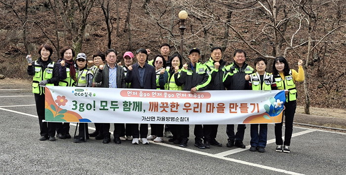 이번 활동은 걷기대회 코스를 중심으로 진행됐으며, 자율방범순찰대원들은 ‘먼저 쓸go, 먼저 줍go, 치우go’라는 3go! 운동 취지에 맞춰 도로변과 하천 주변에 방치된 쓰레기를 수거하며 환경 정비에 구슬땀을 흘렸다.이날 참여한 대원들은 쾌적하고 안전한 걷기 환경 조성을 위해 행사 구간을 사전 점검하는 한편, 지역 주민들에게 마을을 함께 가꾸는 실천의 중요성을 알렸다.김사억 가산면장은 “걷기대회를 앞두고 바쁜 일정에도 불구하고 환경정화활동에 적극 참여해주신 자율방범순찰대원들께 깊이 감사드린다”며 “이번 활동을 계기로 가산면을 찾는 모든 분들에게 청정지역으로 기억될 수 있도록 최선을 다하겠다”고 밝혔다.