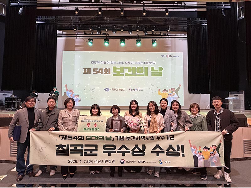 칠곡군은 지난 4월 7일 경산시민회관 대강당에서 열린 경상북도 주최 "제54회 보건의 날”기념행사에서 ‘우수상`을 수상했다. 이번 수상으로 2023년부터 올해까지 4년 연속 수상하는 영예를 안았다.